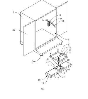參照圖2和圖3,調平結構包括調節板7、齒輪一8、齒輪二9和用于驅動齒輪二9轉動的旋鈕10,調節板7轉動連接于殼體1內,殼體1上開設有供調節板7移動的滑槽11,調節板7的底面呈弧形凹面12設置且弧形凹面12上開設有齒槽13,調節板7頂面的兩側邊倒有倒角23;齒輪一8和齒槽13嚙合;齒輪一8和齒輪二9均轉動連接于殼體1上,齒輪一8和齒輪二9嚙合,齒輪二9的齒數小于齒輪一8的齒數,從而達到一個減速的作用,旋鈕10設置于殼體1外。