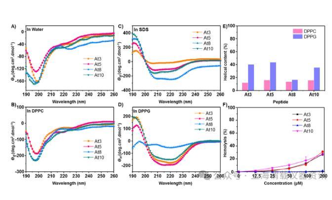 圖2、設(shè)計(jì)肽的二級(jí)結(jié)構(gòu)和溶血特性。(A)水、(B)25 mM SDS、(C)兩性離子DPPC SUV(0.25 mg mL-1)和(D)帶負(fù)電荷的DPPG SUV(0.25 mg mL-1)中肽的CD光譜。所有四種肽(At3、At5、At8、At10)在水和DPPC SUV中均呈現(xiàn)無規(guī)卷曲結(jié)構(gòu),而在SDS和DPPG SUV中均采用螺旋結(jié)構(gòu)。肽濃度固定在0.1 mM。所有測(cè)量均在室溫下進(jìn)行。(E)DPPC和DPPG SUV中肽的α-螺旋含量。(F)肽的溶血活性。用不同濃度的肽處理人紅細(xì)胞(hRBC)并在37°C下孵育1小時(shí)。然后在OD540nm處測(cè)量吸光度。