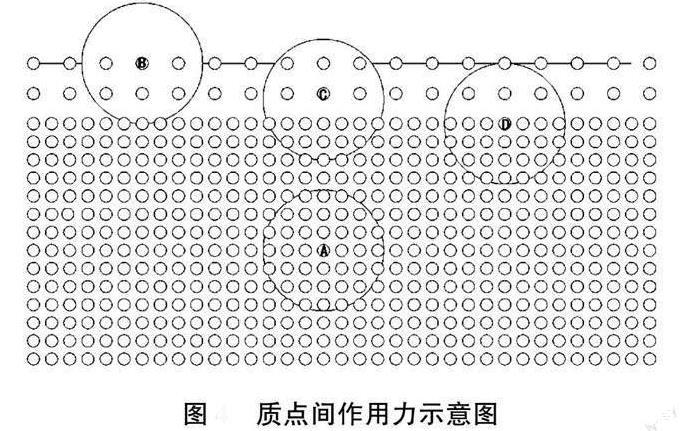 如果以質點中心為圓心,10r0為半徑作一球面,顯然只有在這個球面內的質點才對位于球心上的質點有作用力。熔體的表面層厚度等于質點作用球半徑的一層,在表面層內熔體質點受力的情況跟熔體內部的質點的受力情況有所不同。由圖2可見,位于熔體內部的質點A受到周圍對稱分布的質點的作用,其合力為0。熔體表面層質點上下分布對稱性被打破,處于表層內的熔體質點B、C和D都受到了一個指向熔體內部的力的作用從而向熔體內部移動,使得質點間距離減小,引力轉化為斥力,最終到達平衡狀態。在平行熔體表面的方向,熔體表面層內的質點分布是均勻的,只是間距比較大,質點間作用力表現為引力,這便是熔體的表面張力。由于表面張力的作用,質點之間的距離減小,使得熔體表面積減小,而一定體積的熔體中球體的表面積最小,所以熔體表面有形成球面的趨勢,但這種趨勢會受重力的影響而改變。重力是所有組成熔體的質點所受的力的合力,而表面張力只是表面一層質點間的引力,表面張力相對于重力而言微乎其微,所以對于大體積的熔體,重力作用遠大于表面張力作用,液面呈現平面。對于小體積熔體來說,組成熔體總的質點數較少,表面張力已接近重力,甚至超過重力,使得液面呈現弧形甚至球形。上述的釉滴實驗可以證實這點。