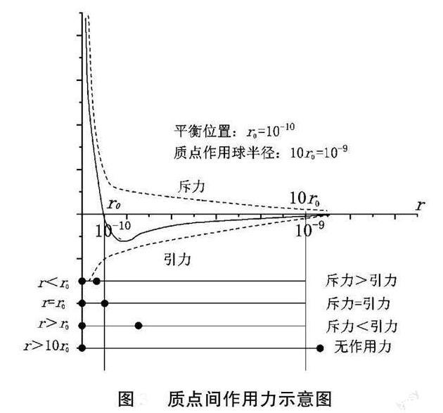 由熔體作用力理論可知,組成熔體的質點間存在著作用力。當質點處于平衡位置時,即質點間距r=r0(r0=10-10)時,引力等于斥力,質點間作用力為0;質點間距r>r0,作用力為引力;質點間距r<r0,作用力為斥力;當質點間距r>10r0時,引力和斥力均為0,如上圖所示。
