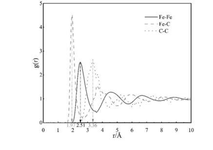 Fe-C二元體系經(jīng)計(jì)算得到的徑向分布函數(shù),F(xiàn)e-Fe、Fe-C、C-C原子對(duì)的平均鍵長(zhǎng)分別為若原子間距離小于相應(yīng)的鍵長(zhǎng)值則表示兩個(gè)原子之間互相連接,根據(jù)碳原子連接的鐵原子個(gè)數(shù),可將鐵原子區(qū)分為自由態(tài)鐵原子(與碳原子沒有配位關(guān)系)、A型鐵(只與1個(gè)碳原子形成配位關(guān)系)、B型鐵(與2個(gè)或更多的碳原子形成配位關(guān)系)三種類別,根據(jù)模擬結(jié)果數(shù)據(jù)可對(duì)鐵原子的配位方式進(jìn)行分析。