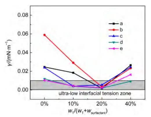 從圖3可見,在所考察的五個油水體系中,界面張力先隨保護劑T的比例增加而下降。當保護劑加入量達到10%-20%(摩爾分數(shù))時,即達到最低界面張力。當進一步加入非離子保護劑時,界面張力值反而有所上升。這是因為當較少的非離子保護劑加入時,可有效控制陰陽離子表面活性劑混合體系的沉淀,使混合體系的表面活性劑有效濃度增加。而當保護劑T比例進一步增加時,陰陽離子表面活性劑的實際總量相應減少,使得界面上陰陽離子表面活性劑的實際含量降低。上述實驗結(jié)果充分說明了保護劑的具體作用,即保護劑起到的作用是控制了實際體系中鈣鎂離子對陰陽離子表面活性劑的不利影響,從而獲得了合理的油水兩相表面活性劑濃度的平衡,但是其本身并沒有對超低界面張力的獲得有實質(zhì)性貢獻,是陰陽離子表面活性劑在有效地降低實際油水界面張力。