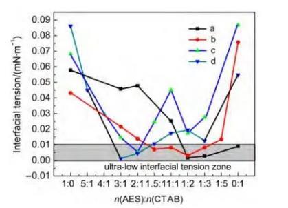 按照陰陽離子表面活性劑:非離子保護劑摩爾比為4:1的比例,在總表面活性劑含量不變的情況下,變化AES/烷基季銨鹽CTAB的混合比例進行研究。實驗結(jié)果顯示,陰陽離子表面活性劑復配體系的沉淀得到很好的控制,在七中、石西、陸九、莫北四個實際油水體系中獲得了較大范圍的超低界面張力區(qū)間(圖1)。從而證明了我們采用的三組分策略可有效幫助陰陽離子表面活性劑復配體系實現(xiàn)超低界面張力。