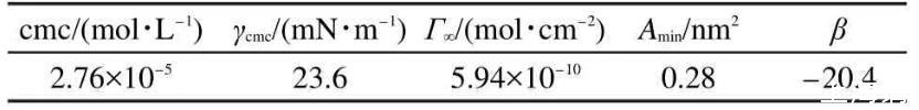 表140°C時烷基季銨鹽CTAB與AES復配體系(摩爾比為1:1)的表面性質(zhì)和特征參數(shù)β