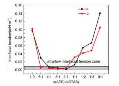 AES/烷基季銨鹽CTAB摩爾比為1:1的混合體系的β參數(shù)計算結(jié)果為~20.4,表明AES與烷基季銨鹽CTAB親水基間具有極強的吸引作用。值得注意的是,該體系還具有很高的溫度穩(wěn)定性,在55°C時仍能保持30 mN·m-1以下的表面張力。這說明在較高溫度時該體系的分子排列仍然較為緊密,這和陰陽離子表面活性劑體系中分子因靜電吸引造成的緊密排列是密切相關的。考慮到油水界面張力同樣與界面上的分子排列有關,因此有可能在溫度較高時實現(xiàn)超低界面張力。