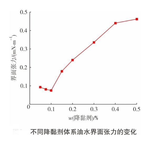 圖1為在不同降黏劑質量分數下,體系油水界面張力的變化情況。從圖1可知,在降黏劑質量分數為0.05%~0.10%時,界面張力隨質量分數增加而降低。當降黏劑質量分數超過0.10%時,界面張力開始上升。在低質量分數下,降黏劑在油水界面上形成吸附膜,降低界面張力。當降黏劑質量分數超過臨界膠束含量后,降黏劑在界面聚集數量增加,吸附層排布更不規則,導致界面張力升高。