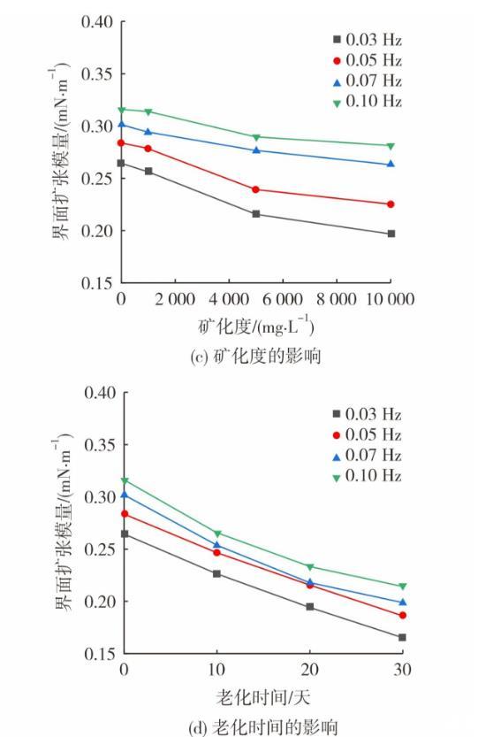 圖3為油藏條件對動態界面張力及界面擴張模量的影響。采用不同礦化度模擬水配制體系(0.06%(w)凍膠分散體+0.10%(w)降黏劑),在50℃老化10天。圖3(a)和圖3(c)呈現了礦化度對體系界面流變性質的影響。從圖3可知,隨著礦化度的提高,老化后體系的動態界面張力穩定值從0.127 mN/m增至0.356 mN/m。降黏劑帶有磺酸鹽基團,有較強的耐溫耐鹽能力,因此界面張力的提升幅度有限。此外,體系的界面擴張模量隨礦化度的增大而減低,這是由于地層水陽離子會對凍膠分散體之間的擴散雙電層產生壓縮作用,減小凍膠分散體表面負電量,降低其分散穩定性,體系黏度隨之下降。