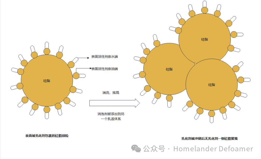 當(dāng)這一種乳液滴加到另一種環(huán)境中,這樣的環(huán)境沒有大量的乳化劑,沒有高粘度體系的支撐,微粒表面的乳化劑會慢慢從硅脂油粒表面脫落,油粒會在液體中做無規(guī)則碰撞,也會撞掉大量乳化劑。當(dāng)表面乳化劑被全部沖刷撞掉,兩個(gè)硅脂油粒會在下一次的碰撞結(jié)合在一起。這樣的碰撞幾率在平穩(wěn)的液面較小,但在較為湍急的液面較大,會較為快的聚集為較大的絮狀物。