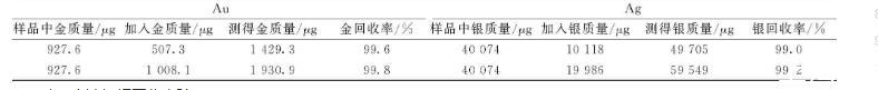 表2結果為用乙酸除鉍火試金法,再進行如表1的實驗,從表2可以看出金加標回收率99.2%~101%,銀加標回收率98.2%~99.7%,說明已消除鉍的干擾,結果準確可靠。