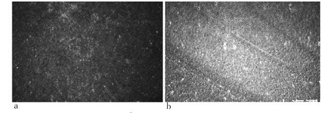 利用BAM研究了DEAE-瓊脂糖單分子膜的成膜過程,圖4為表面壓為0 mN/m和34 mN/m的BAM圖像結果。通過對BAM圖像的觀測,可以看出其成膜過程,確定其是否成膜。圖4-a為DEAE-瓊脂糖剛滴加在亞相上的BAM圖像,分子被平鋪在亞相表面,相對分散,呈氣相狀態,此時布魯斯特角的折射不受表面分子影像,圖像顏色較深,看不出分子的具體形態。待其揮發一定時間后,隨著滑障的持續壓縮,DEAE-瓊脂糖由分散狀態到聚集成膜,最后在亞相上形成相對穩定的固相區域。圖4-b為固相狀態下的DEAE-瓊脂糖單分子膜,可以看出此時分子之間排列緊密,分子間距較小,已經形成固相狀態。由于分子在亞相表面緊密排列形成了單分子層,改變了布魯斯特角的折射,使得圖像的顏色變淺。通過對表面壓為0 mN/m和34 mN/m的BAM圖像對比可以看出,DEAE-瓊脂糖分子由一開始的分散狀態到達最后穩定的固相狀態,成功形成了穩定的便于提拉的單分子層。