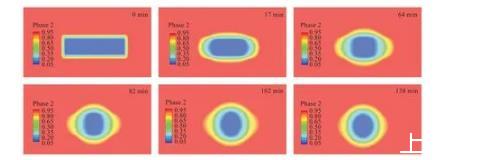 由計算流體力學后處理軟件所得到的液滴形態變化圖,可以看到液滴由最初的圓柱形變化成橢球形,再由橢球形變化成球形。與實驗所得到的各時刻形態圖液滴變化趨勢相同,時間上略有誤差,可能是由于基質導熱速率、加熱臺功率,以及室溫的影響。