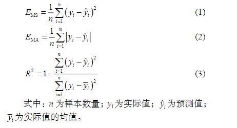 按照8∶2的比例將實驗數(shù)據(jù)劃分為訓練集和測試集,對每個模型進行訓練,并在測試集上進行驗證。這里選用3種常用于回歸任務(wù)的評價指標:均方誤差(MSE)、平均絕對誤差(MAE)和決定系數(shù)(2)。MSE和MAE可以衡量預(yù)測值與真實值之間的誤差,數(shù)值越小表示模型預(yù)測的越準確;2度量模型擬合數(shù)據(jù)的程度,取值范圍在0到1之間,越接近1表示模型對數(shù)據(jù)的擬合程度越好。這3個評價指標的計算公式如下所示: