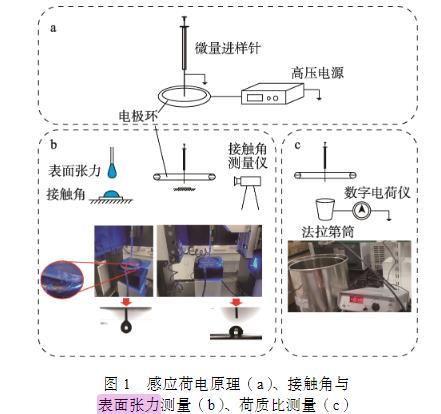 圖1感應(yīng)荷電原理(a)、接觸角與表面張力測量(b)、荷質(zhì)比測量(c)