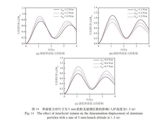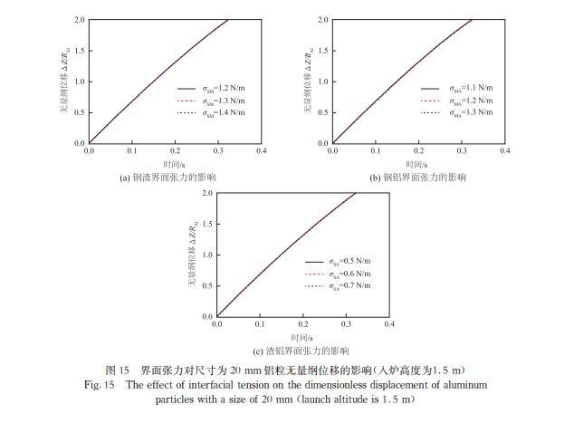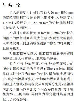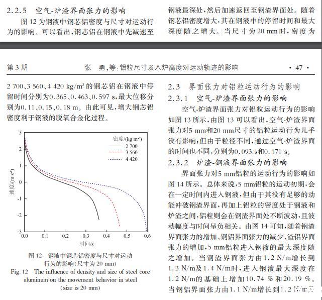 增加鋼渣界面張力、減小鋼鋁界面張力或增加渣鋁界面張力有利于鋁粒進(jìn)入鋼液,而鋁粒的尺寸大于20 mm,界面張力對(duì)鋁塊運(yùn)動(dòng)幾乎沒有影響;增大密度會(huì)使鋼芯鋁在鋼液中停留更長(zhǎng)時(shí)間,有利于鋼液脫氧。