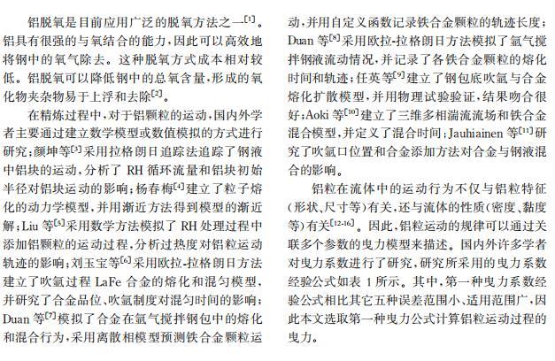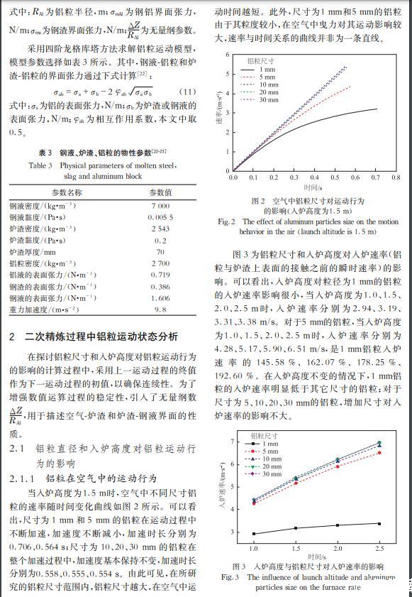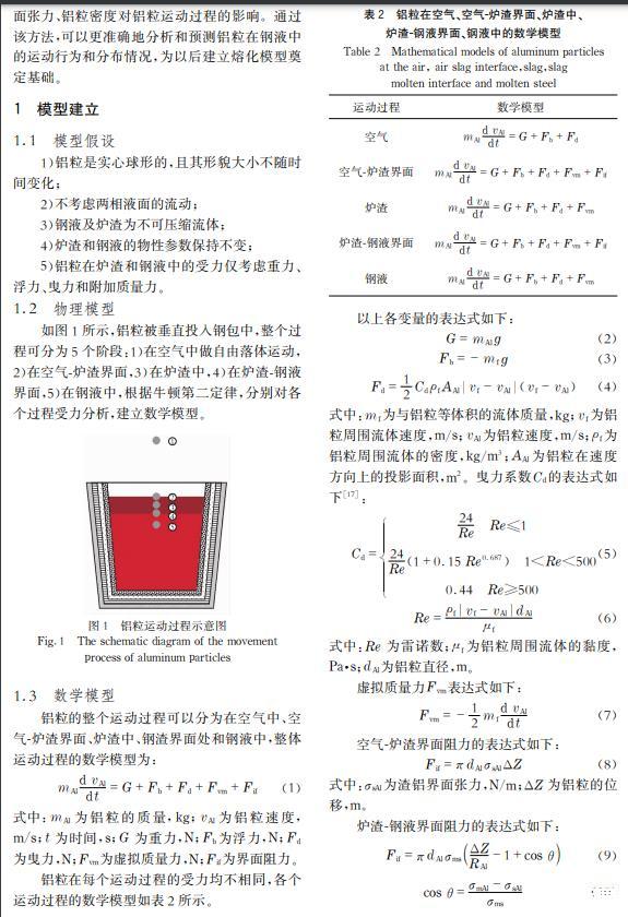 摘要: 二次精煉過程中,鋁是鋼液進(jìn)行脫氧及合金化的主要物料之一,但純鋁的密度小于鋼液,能否穿越渣層與鋼液接觸及接觸時(shí)間對(duì)鋁的脫氧效果和鋼中溶解鋁的含量有直接影響。在忽略鋁的熔化、溶解及化學(xué)反應(yīng)的情況下,通過對(duì)鋁粒運(yùn)動(dòng)過程受力分析,建立鋁粒在氣-渣-鋼相內(nèi)的三維運(yùn)動(dòng)數(shù)學(xué)模型,明晰鋁粒尺寸及入爐高度對(duì)鋁粒運(yùn)動(dòng)軌跡的影響。