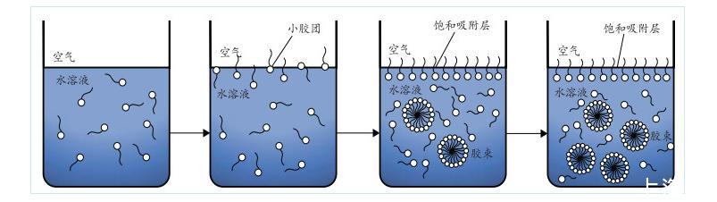 由圖2可知,隨著溶液中EMI質量分數的增大,表面張力持續降低。當溶液中EMI質量分數大于0.6%后,表面張力的變化趨勢逐漸變緩,幾乎維持在同一水平。出現這種現象的主要原因在于加入溶液中的EMI會對溶液的表面張力產生重要影響。EMI分子本身具有兩親性質,其中有機高分子會在溶液的表面形成吸附,并在液面定向排列,使疏水基擴展于空氣中,親水基則與水面吸附,溶液中EMI分子吸附狀態隨其質量分數變化情況如圖3所示。吸附于水面的EMI分子達到飽和狀態時,EMI溶液的膠束質量分數便達到臨界值,EMI分子開始締合逐步形成膠束聚集物,該質量分數即為溶液的CMC值。之后,繼續加入EMI溶液,表面張力不再發生較大波動,溶液內逐漸締合成更多穩定的膠束。