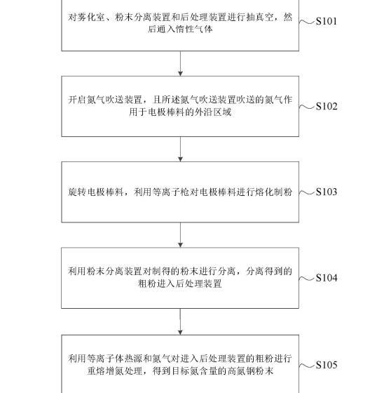 本實施例中,利用氮氣對電極棒料101的外沿區域進行作用,使氮氣與電極棒料101外沿的熔池進行反應,熔池吸氮過程降低了熔池外沿待破碎液膜區域的表面張力,使粉末粒度更??;同時電極棒料101中心區域的液膜移動到電極棒料101外沿時,由于氮氣作用于外沿區域,會繼續對該液膜進行擾動,降低了液膜的表面張力,進而得到粒徑更小的粉末;由于制得的粉末粒徑更小,粉末冷卻速度較快,氮元素析出更少,存留在細粉中的氮含量更高,從而得到氮含量更高的高氮鋼粉末,最終達到制備細粒徑高氮含量的高氮鋼粉末。