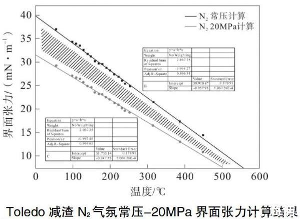 不同溫度條件下的線性下降的斜率與溫度的變化也基本呈現出一定的的線性。另外,對于不同壓力下的界面張力-溫度關系,理論上應當都是線性變化,因此,斜率變化的線性變化規律也是符合一般規律的。由此可以推測得到在相應溫度條件下的線性下降斜率,從而由N2常壓條件下Toledo減渣的界面張力推測得到N2在20 MPa氣氛條件下Toledo減渣的界面張力。