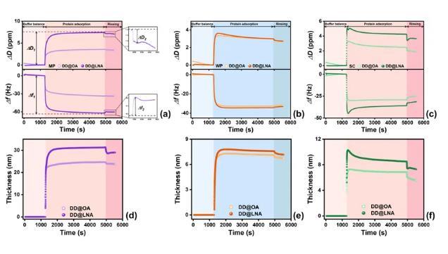 圖6.QCM-D試驗:(a)MP,(b)WP和(c)SC在不同飽和度界面上吸附時的共振頻率遷移(Δf)與能量耗散遷移(ΔD);(d)MP,(e)WP和(f)SC在不同飽和度界面上形成的吸附層厚度