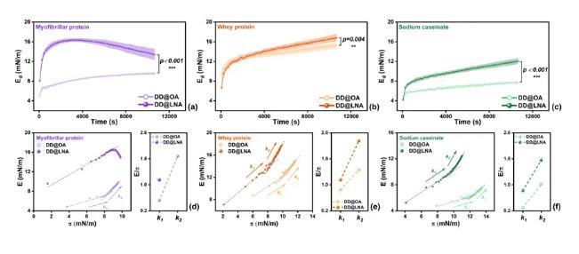 圖4.線性粘彈區域內(振幅10%),不同飽和度界面上(a)MP,(b)WP和(c)SC界面膜的彈性模量;(d)MP,(e)WP和(f)SC界面膜的膨脹模量-界面壓力關系圖。*p<0.05,**p<0.01,***p<0.001