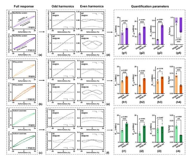 圖5.非線性粘彈區域內(振幅30%),不同飽和度界面上(a)MP,(b)WP和(c)SC界面膜的利薩茹圖像;通過GSD算法得到的(d)MP,(e)WP和(f)SC利薩茹圖像的τ1,τ2,τ3,τ4分解組分;根據τ1,τ2,τ3,τ4計算得到的(g1-g4)MP,(h1-h4)WP和(i1-i4)SC的Eτ1L,Eτ1M,Eτ4模量與S-因子。*p<0.05,**p<0.01,***p<0.001