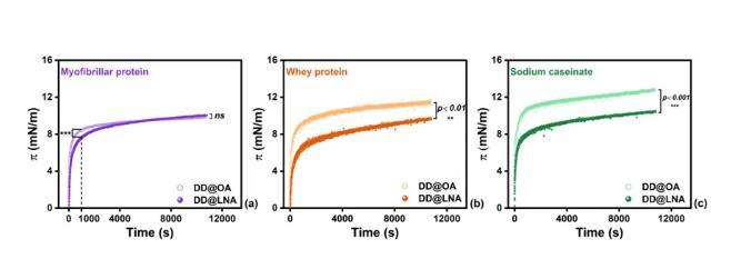 圖2.(a)MP,(b)WP和(c)SC在不同飽和度界面上吸附時的界面壓力。*p<0.05,**p<0.01,***p<0.001,ns無顯著差異