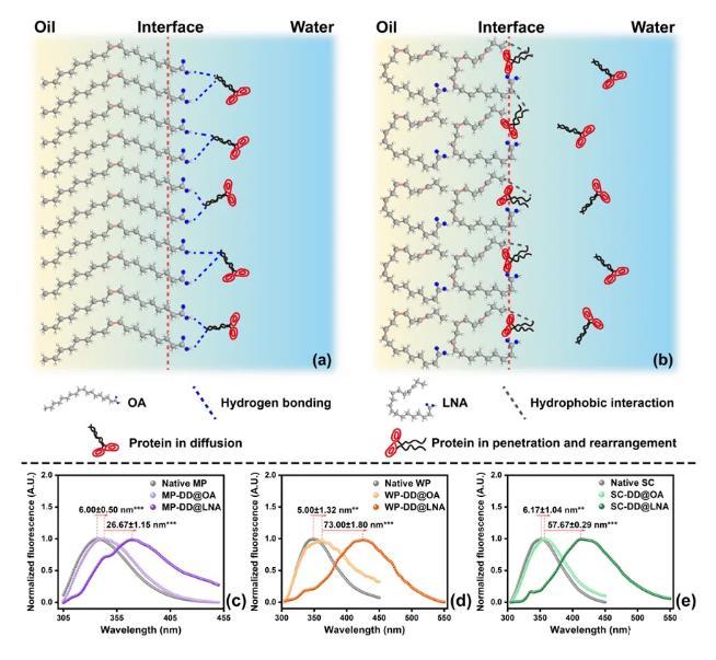 圖3.(a-b)油脂不飽和度影響蛋白質界面吸附動力學的機制示意圖;界面(c)MP,(d)WP和(e)SC的歸一化前表面熒光光譜。*p<0.05,**p<0.01,***p<0.001