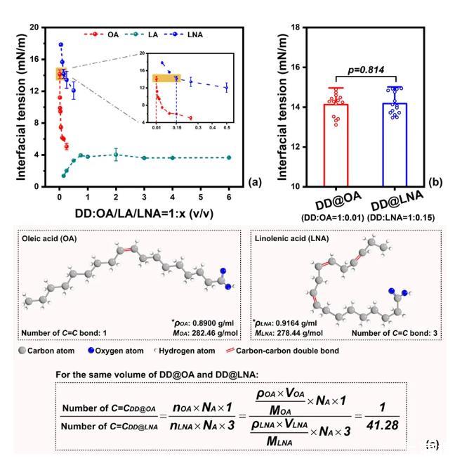 圖1.模型油脂的篩選:(a)油酸/亞油酸/亞麻酸與十二烷不同體積比例復配后的油-水界面張力;(b)最終篩選得到的兩種模型油相的界面張力(DD OA和DD LNA);(c)相同體積下,DD OA與DD LNA分子內的碳-碳雙鍵比例