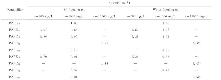 (1)在實驗范圍內,9種PAPEmn破乳劑均能夠有效降低孤東二元驅原油體系油-水界面張力,而且其降低油-水界面張力的能力要顯著強于一些常規破乳劑。