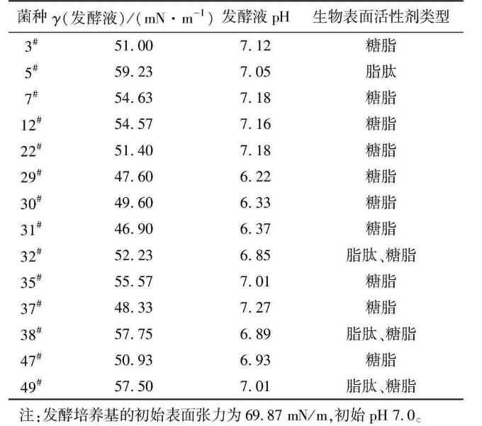 經(jīng)富集分離共得到49株細(xì)菌,初步篩選出14株生長較好的目的菌株接種于發(fā)酵培養(yǎng)基。在微生物采油過程中,表面活性劑和有機(jī)酸可以把原油從巖層中剝離下來,提高原油流動性。因此,以發(fā)酵過程中發(fā)酵液的pH和表面張力的降低為指標(biāo),對初篩得到的菌株進(jìn)行復(fù)篩,同時分析所產(chǎn)生物表面活性劑的類型,結(jié)果見表1。