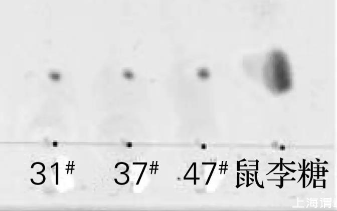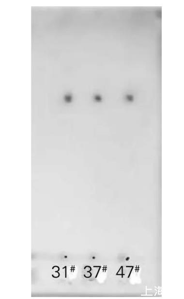 將菌株31#、37#和47#于30℃培養(yǎng)后,對發(fā)酵液萃取所得生物表面活性劑粗制品進(jìn)行硅膠薄層層析,結(jié)果如圖4所示。將萃取所得生物表面活性劑粗制品進(jìn)行酸解,硅膠薄層層析結(jié)果如圖5所示。