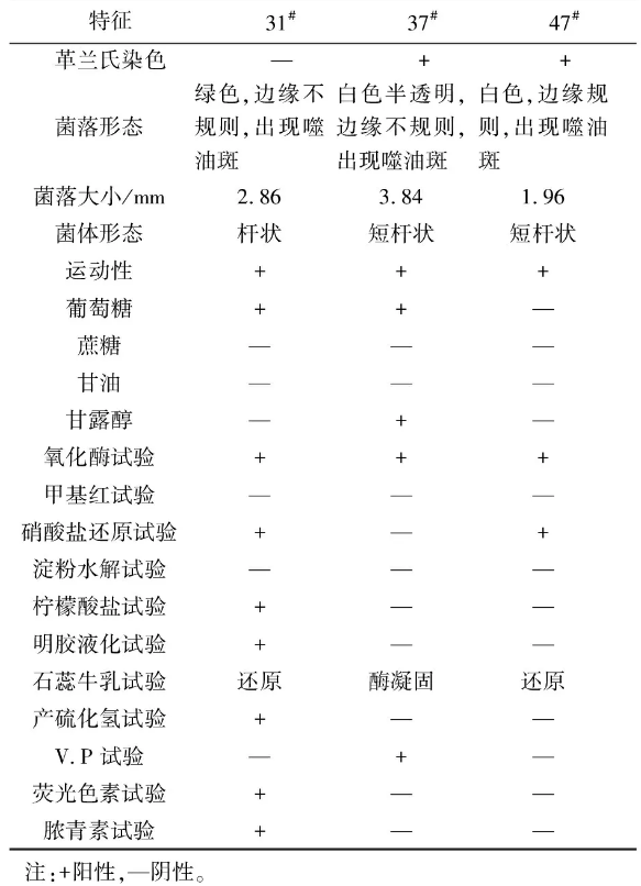 對篩選所得菌株進(jìn)行常規(guī)生理生化特性實驗,結(jié)果如表2所示。根據(jù)表2所示結(jié)果和《伯杰氏(Berge)菌種鑒定手冊》的描述,可鑒定菌株31#為假單孢屬,菌株37#、47#均為芽孢桿菌屬。