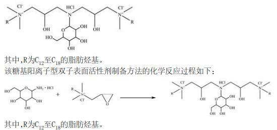 將所需量的2,3-環(huán)氧丙基-N,N-二甲基烷基氯化銨和氨基葡萄糖鹽酸鹽溶于水中,反應后,得到糖基陽離子型雙子表面活性劑的水溶液,其中,2,3-環(huán)氧丙基-N,N-二甲基烷基氯化銨與氨基葡萄糖鹽酸鹽的摩爾比為2至2.2:1,2,3-環(huán)氧丙基-N,N-二甲基烷基氯化銨與氨基葡萄糖鹽酸鹽的總質(zhì)量與水的質(zhì)量比為1:9。