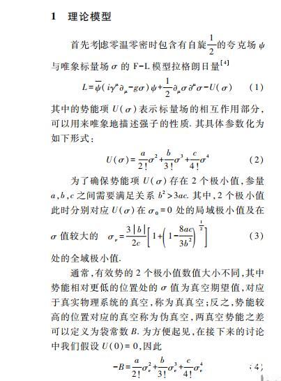 本文具體采用的模型是具有夸克禁閉性質(zhì)的Friedberg-Lee模型(F-L Model)。F-L模型最初用于描述低能時強子的行為,將強子看做真空中的袋狀孤子解,為QCD理論中的禁閉行為提供了非常直觀的物理解釋。不僅如此,該模型也被擴展至有限溫度密度下夸克物質(zhì)的退禁閉相變的研究,提供了研究夸克強子相變性質(zhì)的有利手段。但是該模型只能給出有限溫度密度下夸克物質(zhì)一級相變的結果,無法討論平滑過渡(Crossover)相變和相臨界截點相關的物理問題,具有一定局限性。不過本文主要研究夸克強子一級相變下氣泡或液滴的動力學問題,F(xiàn)-L模型是比較合適的模型。
