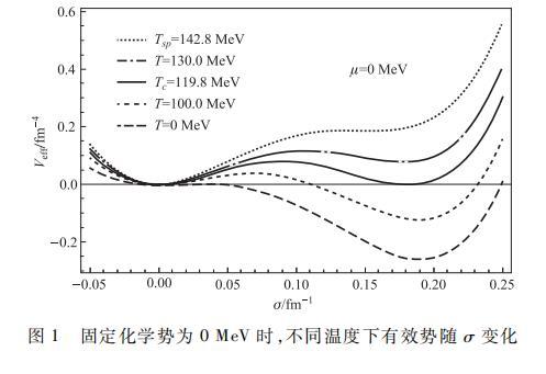 為了更加準確地描述夸克-膠子等離子體(Quark-Gluon plasma,QGP)與強子物質(zhì)之間的相變特征,在溫度密度有限的情況下,通過嚴格的數(shù)值方法,固定化學勢為μ=0 MeV,作出如下有效勢Veff隨σ場變化的函數(shù)關系圖像。其中,由上至下曲線的溫度依次設定為T=142.8,130.0,119.8,100.0以及0 MeV.如圖所示,在溫度相對較低時,每條勢能曲線都具有兩個極小值和一個極大值,一個極小值位于σ較小的σ0處,另一個極小值位于σ較大的σv處,其間存在一個局域極大值,對應兩極小值之間存在的勢壘。