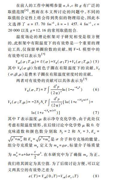由于氣泡或液滴只有在一級相變過程中才會出現(xiàn),而F-L模型將復雜的膠子場簡化為易處理的標量場進行唯象地描述,能夠抓住夸克物質(zhì)一級相變中氣泡或液滴動力學中的關鍵物理性質(zhì),同時帶來非線性動力學場方程求解上的極大簡化,因此本文采用F-L模型。雖然在研究QCD的有效模型中還有各種手征模型,但是考慮到其具有同位旋內(nèi)稟自由度,對應氣泡或液滴的動力學場方程將變得更為復雜,我們將在未來的工作中進一步考慮這些問題。