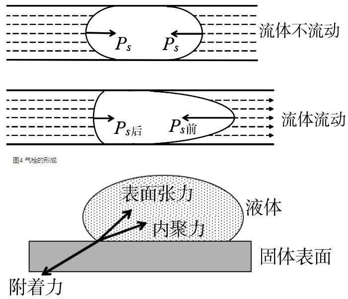 液體流動時會受到液體中氣泡的阻礙作用。若流管較細且液體中氣泡較多時可能會因為氣體阻礙作用嚴重而造成流管堵塞,這種現象稱氣體栓塞,簡稱氣栓。
