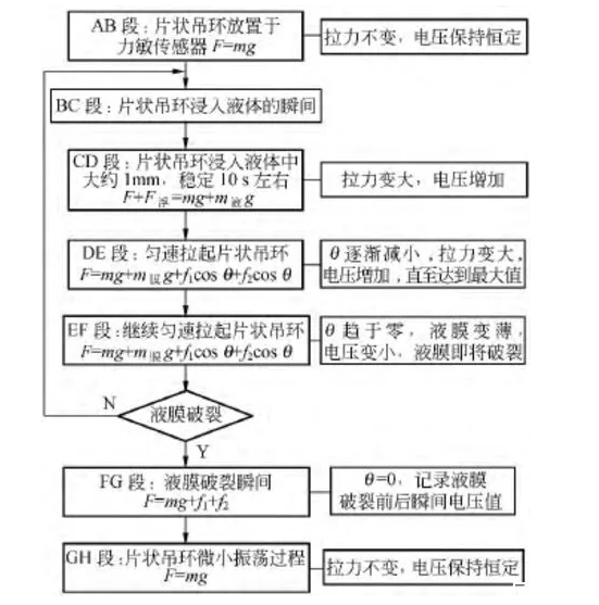 根據(jù)受力情況將圖4的液膜拉脫過程電壓變化曲線分為6個階段,圖5為液膜拉脫過程方框圖,不同階段片狀吊環(huán)的受力情況不同,電壓變化值也不同,在液膜破裂前后瞬間,忽略液膜的重力,表面張力與重力方向完全一致,此時F=mg+f1+f2,可得到液體的表面張力。由圖4發(fā)現(xiàn),不同液體在EF階段的電壓變化情況不同,無外加磁場作用時2F號磁性液體在EF階段存在轉折點Q,越過轉折點,QF階段電壓變化較平緩,且表面張力越小;而7#白油和1F磁性液體并未出現(xiàn)此現(xiàn)象。出現(xiàn)該現(xiàn)象的原因是7#白油和1F磁性液體表面張力較大,當液膜被拉脫到一定程度時,很快破裂;而2F號磁性液體由于表面張力較小,液體分子與分子之間的作用力減弱,宏觀表現(xiàn)為拉脫的液膜更長,液膜在空氣中會存在一段時間,此時液膜質量很小,可忽略不計,電壓變化較平緩。有外加磁場作用時,1F和2F號磁性液體在FG階段并未出現(xiàn)電壓變化平緩的中間過程,但有外加磁場作用于磁性液體時,F(xiàn)G階段出現(xiàn)了一些數(shù)據(jù)點,液膜破裂的時間大于無外加磁場作用時的時間,主要是由于外加磁場增強了磁性顆粒之間的相互作用,分子和分子之間的磁吸引力增強,導致液膜逐步破裂。