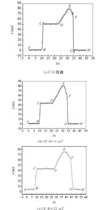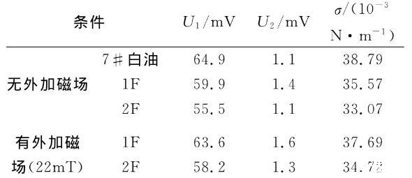 計算機實時在線采集了2種磁性液體及白油液膜拉脫過程中電壓隨時間的變化曲線,如圖4所示。從圖4可看到,3種液體的電壓變化規(guī)律一致,圖中F和G兩點是液膜破裂前后瞬間的電壓值,片狀吊環(huán)的內外徑分別為33.10mm和34.69mm,根據(jù)(6)式即可計算出液體的表面張力。室溫(20±0.5)℃時各液體的表面張力見表2.7#白油的表面張力大于磁性液體,這主要是因為表面活性劑的加入降低了液體的表面張力。當22mT的磁場作用于磁性液體時,磁性液體的表面張力增加,這主要是因為無外加磁場作用時,各磁性顆粒的磁矩方向雜亂無章,互相抵消,磁性液體不顯示宏觀磁性。當外加磁場作用于磁性液體時,且磁場方向平行于切線方向的磁性液膜時,各磁性顆粒的磁矩方向轉向外加磁場方向,外加磁場增強了磁偶極子之間的相互作用,導致磁性液體的表面張力增加。