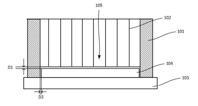 如圖1所示,在一個(gè)實(shí)施例中,所述筒壁101與所述隔離網(wǎng)壁102的高度差為晶圓104高度加上5微米~500微米之和。當(dāng)所述筒壁101被真空吸附臺(tái)103固定時(shí),所述隔離網(wǎng)壁102與所述晶圓104表面的非接觸氣隙的間距D1為5微米~500微米,本發(fā)明的非接觸氣隙被配置為當(dāng)腐蝕液進(jìn)入某一個(gè)腐蝕區(qū)域105時(shí),基于液體表面張力使得腐蝕液不會(huì)進(jìn)入到相鄰的腐蝕區(qū)域105,可以避免隔離網(wǎng)壁102對(duì)晶圓104造成損傷,大大提高工藝穩(wěn)定性,同時(shí),可以消除因晶圓104表面不平整導(dǎo)致的直接接觸造成高度差異而產(chǎn)生有的部分直接接觸的情況。