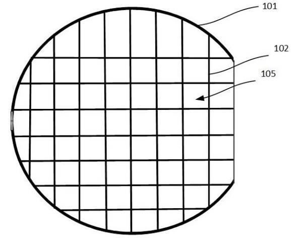 如圖1~圖2所示,本實(shí)施例提供一種用于晶圓104分區(qū)腐蝕的隔離網(wǎng)筒,所述隔離網(wǎng)筒包括:筒壁101,用于套設(shè)于晶圓104外圍,并與所述晶圓104共同被真空吸附臺(tái)103吸附固定;隔離網(wǎng)壁102,固定于所述筒壁101內(nèi),用于將晶圓104表面分隔成多個(gè)相互獨(dú)立的腐蝕區(qū)域105,當(dāng)所述筒壁101被真空吸附臺(tái)103固定時(shí),所述隔離網(wǎng)壁102延伸至晶圓104表面上方,并與晶圓104表面具有間距以形成非接觸氣隙,所述非接觸氣隙被配置為當(dāng)腐蝕液進(jìn)入某一個(gè)腐蝕區(qū)域105時(shí),基于液體表面張力使得腐蝕液不會(huì)進(jìn)入到與該腐蝕區(qū)域105相鄰的另一個(gè)腐蝕區(qū)域105。