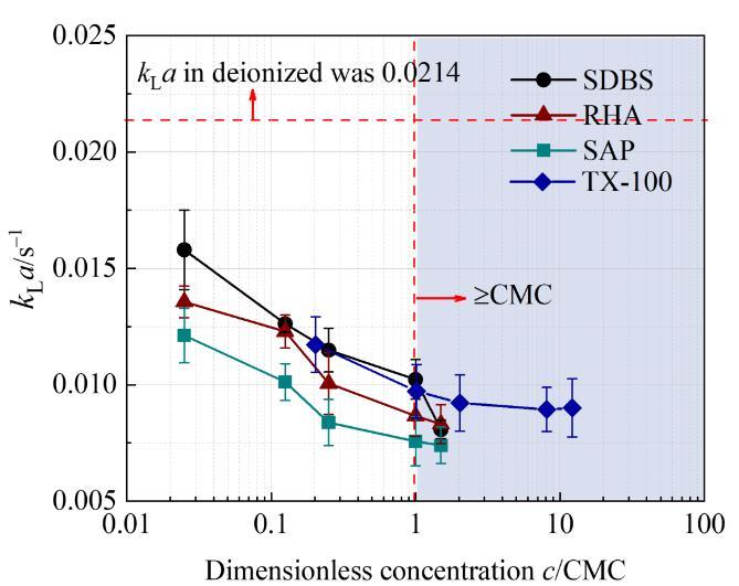 含表面活性劑微納米氣泡曝氣系統(tǒng)的體積傳質(zhì)系數(shù)(kLa)值如圖2所示。在四種表面活性劑溶液中,kLa值均隨表面活性劑濃度增加而降低。當(dāng)c/CMC小于1時(shí),降低的趨勢(shì)更明顯。這說(shuō)明少量的表面活性劑即可對(duì)傳質(zhì)產(chǎn)生顯著影響。此外,非離子型表面活性劑對(duì)kLa的影響大于離子型表面表面活性劑。分子量大的RHA比SDBS具有更顯著的傳質(zhì)抑制作用。