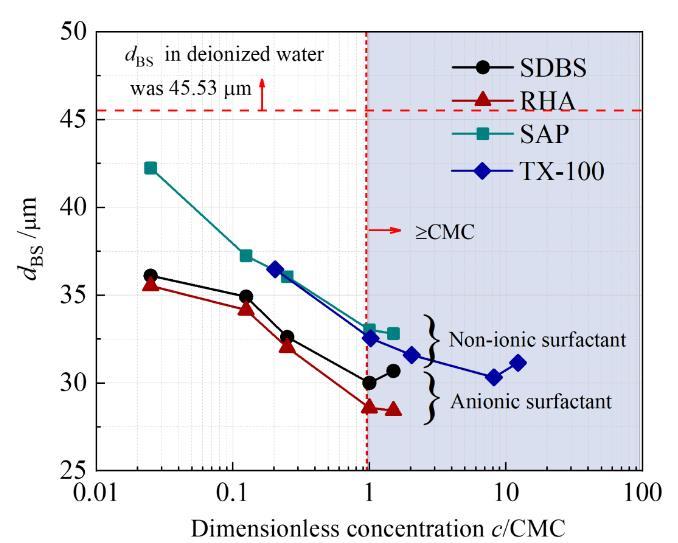 在不更新氣泡表面和表面活性劑分子抑制凝聚的共同作用下產(chǎn)生了粒徑更小的微納米氣泡。表面活性劑濃度大于CMC值的溶液中的微納米氣泡的粒徑小于表面活性劑濃度小于CMC的溶液中的。該現(xiàn)象主要是因?yàn)楫?dāng)表面活性劑濃度小于CMC值時(shí),表面活性劑分子不足以完全覆蓋氣泡表面。另外,如圖1所示,隨著濃度增加,微納米氣泡的粒徑降低,當(dāng)c/CMC值大于1時(shí),溶液的表面張力達(dá)到了穩(wěn)定值,但微納米氣泡的粒徑持續(xù)減小。