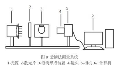 懸滴法的原理是利用液滴靜止懸掛在毛細管的管口處時,液滴的外形主要取決于重力和表面張力的平衡。通過測定懸掛著的液滴的外形參數,可推算出液體表面張力。懸滴法的測量試驗系統主要由光源、散光片、液滴形成裝置、鏡頭、相機、計算機等組成。測試步驟也很簡單,不需要清洗儀器,制樣完成后,接通電源,調節控溫器使溫度達到預設溫度點。將裝好試樣的石英比色皿和注射器置于恒溫室中,針頭必須保持垂直。一般液體恒溫時間為 30 min??刂谱⑸浔眠M樣成滴,當液滴接近最大直徑時,按動快門,記錄液滴圖像,將攝影膠片印制成圖像。該檢測方法表面張力測定精度也是±0.1% 。此外要注意管尖的口徑不能過大以致生成大懸滴,溫度波動會產生對流和振動,使懸滴不穩定。