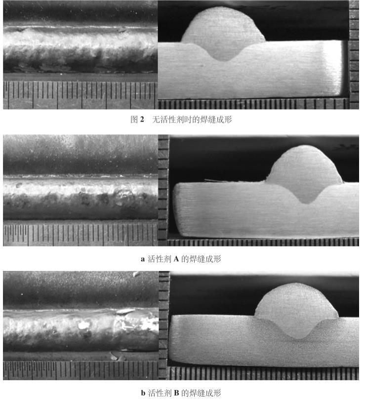 試驗前先將試樣除銹,用角磨機打磨,再用酒精或丙酮擦拭,去除油污及其他雜質。然后稱取一定量的活性劑,用乳化劑酒精進行充分乳化,調配攪拌成糊狀。用扁平毛刷將活性劑涂于工件待焊位置寬20 mm的區域,活性劑涂覆厚度以覆蓋金屬表面光澤為宜。最后在如表1所示的同一焊接參數下進行焊接試驗。觀察焊接現象,用RCU5000i外加存儲卡記錄焊接過程參數變化;焊后觀察焊縫的宏觀成形,并記錄結果;將試驗所得焊縫沿距尾部30mm的距離進行切割,然后打磨、拋光、腐蝕和觀察金相,記錄焊縫的熔深、熔寬等焊縫參數,計算焊縫的熔深比等。