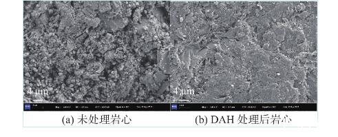 將打磨好的未處理巖心和防水鎖劑DAH處理后的巖心采用掃描電鏡進行測試,結(jié)果如圖9所示。由圖9(a)可知,未處理的巖心表面較為粗糙,存在較多大顆粒與微孔隙,在親水礦物和毛細管力的綜合作用下,巖心表面呈親水性。如圖9(b)所示,DAH處理后的巖心表面更為光滑,微孔隙數(shù)目減少,這是因為防水鎖劑中的DAT分子通過靜電作用在巖心表面吸附形成薄膜。DAT分子兩端的季銨結(jié)構(gòu)可以通過靜電作用吸附在砂巖表面,中間的聚硅氧烷鏈段具有良好的柔韌性和旋轉(zhuǎn)靈活性,使得DAT分子可以在巖心表面密集覆蓋。同時聚硅氧烷鏈段的柔韌性也使其兩側(cè)的甲基可以高密度堆積,這種堆積使得巖心表面獲得較強的疏水性,從而降低了液相返排阻力,減輕了水鎖損害。