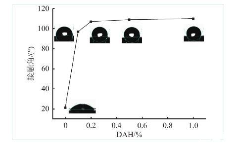 將巖心切片,使用800號金相砂紙將巖心片充分打磨,在室溫下將巖心片放入不同濃度的防水鎖劑DAH溶液,浸泡10 h,取出后在室溫下晾干,使用OCA-25型光學(xué)接觸角測定儀測定蒸餾水在巖心片表面的接觸角,結(jié)果見圖4。