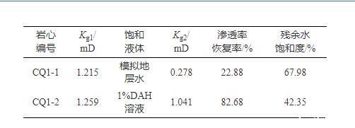 將一塊巖心截為兩塊,測量兩塊巖心干態(tài)下氣測滲透率Kg1,之后將兩塊巖心分別飽和模擬地層水和DAH溶液,使用氮氣在相同壓力下將兩塊巖心驅(qū)替至平衡,測量巖心氣測滲透率Kg2及殘余水飽和度,計算氣驅(qū)后滲透率與干態(tài)下滲透率比值,即為巖心滲透率恢復(fù)率。如表2所示,使用模擬地層水飽和巖心后,滲透率恢復(fù)率僅有22.88%,水鎖損害嚴(yán)重,而使用1%DAH溶液飽和巖心后,滲透率恢復(fù)率高達82.68%,水鎖損害程度大幅降低,殘余水飽和度更低,液相返排也更容易。
