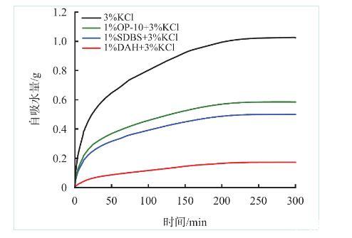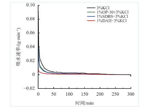 由圖5可以看出,水相會在毛細管力的作用下自吸入巖心,初始階段巖心的自吸水量較大,經(jīng)過200 min后達到平衡,自吸水量不再增加;加入DAH后,巖心自吸水量下降83.1%,且相較于常用防水鎖劑OP-10、SDBS效果更佳。圖6同樣表明,加入DAH后,巖心自吸水速率大幅降低,整個自吸過程中速率緩慢。上述實驗表明,DAH可以減少因毛細管力被吸入地層的水相,從而降低水鎖損害發(fā)生的風(fēng)險。