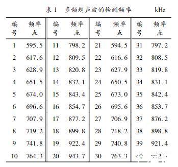 該系統由3部分組成:超聲波傳感器、多頻超聲波控制單元和數據處理單元。多頻超聲波控制單元包括產生超聲波信號的超聲波發射模塊和用于接收超聲波信號的超聲波接收模塊,其中超聲波傳感器的輸入端與超聲波發射模塊連接,超聲波傳感器的輸出端與超聲波接收模塊連接。與多頻控制單元的信號輸出口相連接的超聲波發射器將電信號經過延遲線中的超聲換能器轉換為聲波信號,并進入測量室中的待測介質變壓器油中進行傳播。超聲波發射模塊每20s產生40個頻率范圍為590——1000kHz的超聲波信號,40個頻率點如表1所示。